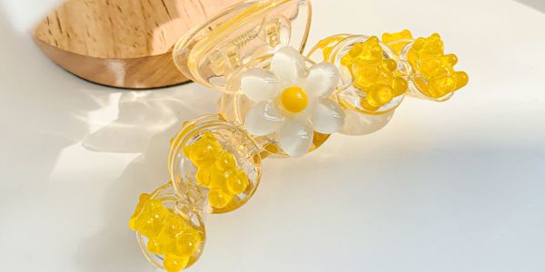Kẹp càng cua bên dưới có màu trong suốt, đính trên đó là 4 chú gấu màu vàng, thoạt nhìn qua cứ như chú gấu trong kẹo chip chip các bạn hen. Ngoài ra còn mix thêm một chiếc bông cúc nhỏ xinh để làm điểm nhấn. Điều này giúp cho chiếc kẹp trở nên dễ thương và đáng yêu hơn, không còn đơn điệu.