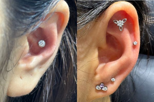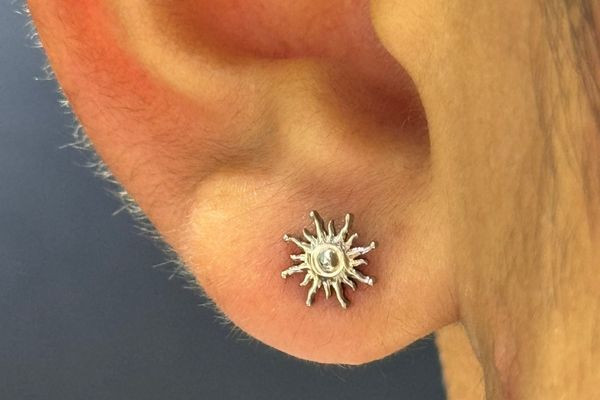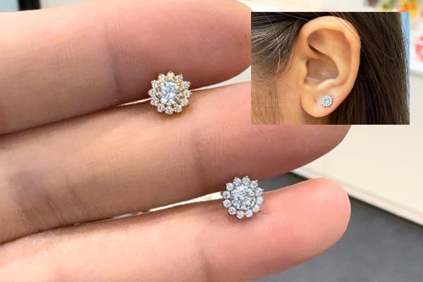 Cuối cùng đó là chiếc khuyên basic giống hình ông mặt trời, mang một chút phong cách cổ điển, cá tính. Kiểu dáng của sản phẩm này phù hợp rất nhiều vị trí trên tai và ít kén dáng tai.