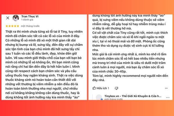 Nội dung feedback: Thật ra thì mình chưa từng xỏ lỗ tai ở Tiny, tuy nhiên mình đã chăm sóc tất cả các lỗ xỏ của mình ở đây. Có những lỗ xỏ mình đã xỏ một thời gian rất dài nhưng bị bump và lở, sưng tấy, đến đây với sự chăm sóc tận tình của bạn chủ mình đã hết sưng tấy chỉ sau 1 tuần và các lỗ đều lành, đẹp, khỏe đến giờ luôn. Về sau mình giới thiệu chỗ của bạn với bạn bè mình có những lỗ xỏ không ổn, thì bạn mình cũng nói rằng chỉ hai lần đến đây là hết hẳn luôn í. Mình cũng rất respect cách bạn chăm sóc và yêu cầu uống thuốc hay ngậm kháng sinh. Thật ra việc dùng thuốc kháng sinh nó hoàn toàn cần thiết đối với những vết thương bị viêm nhiễm ạ nên điều đó là hoàn toàn bình thường nha mọi người, chứ nhiều nơi cứ khăng khăng không cần dùng thuốc, hay là dùng không tốt ảnh hưởng này kia mình thấy "ảo" quá, bị sưng viêm nếu không dùng thuộc sẽ viêm nhiễm năng, dễ gây hoại tử hay nhiễm trùng máu í vì đây là vết thương hở mà.