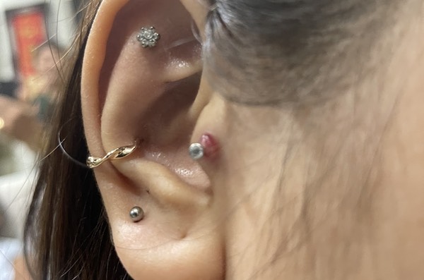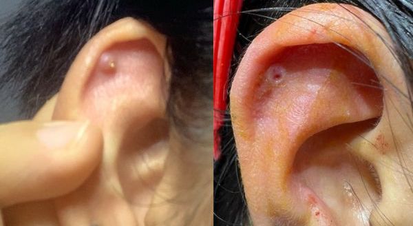 Bên dưới đây là chị khách bấm lỗ tai ở tiệm vàng xong bị bump, có triệu chứng sắp hình thành sẹo lồi. Nhưng sau 1 tuần xử lí và quay lại kiểm tra, khách hàng tại TinyBox cải thiện được 70-80%. Và chị khách hàng vẫn đang được theo dõi, tái khám, kết hợp uống thuốc trị bump lỗ xỏ cho đến khi hết hẳn.